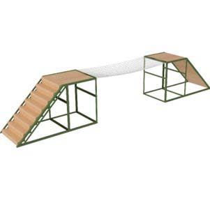 主要尺寸:9000*800*1500mm; 材料规格:框架由40和50角钢焊接而成; 木板为厚40mm的防腐木; 斜板长2200mm,梯台阶高150mm,宽250mm;网长3500-5000mm;网为涤纶、线径3mm; 金属表面喷砂除锈,